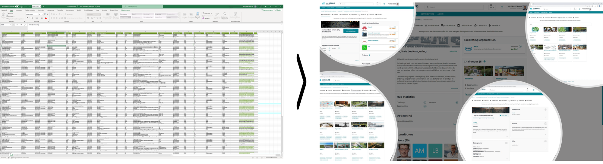 The ‘Digitale Leefomgeving’ program includes 104 different projects all around the Netherlands. Excel is a good tool to get an initial overview on the projects, but it is very limited when it comes down to actually collaborating on these projects and showing others your progress. Alkemio offers the tools to work on these projects and exchange lessons learned. This is not only important for the current projects, but also for similar programmes that will take place in the future.