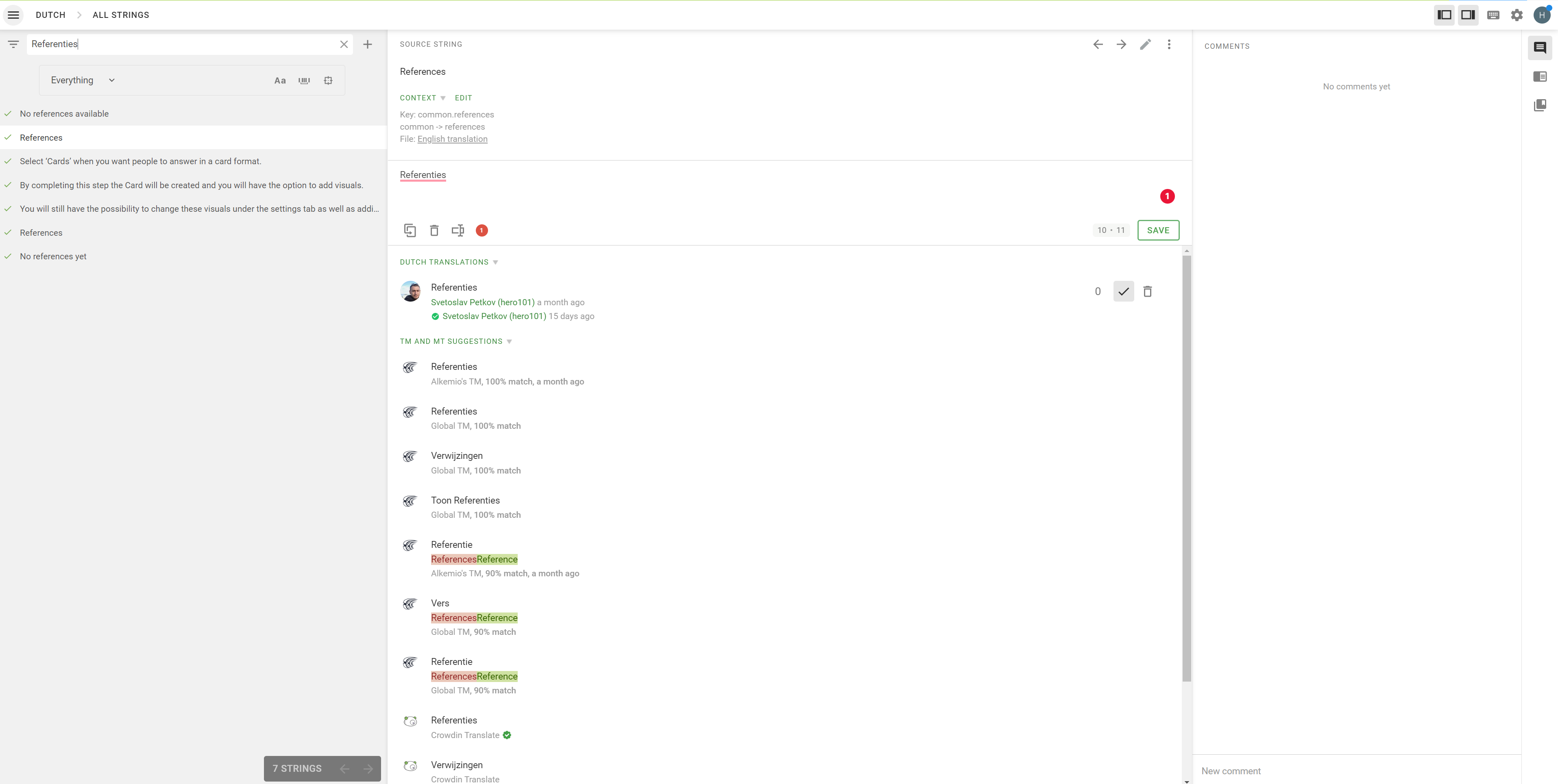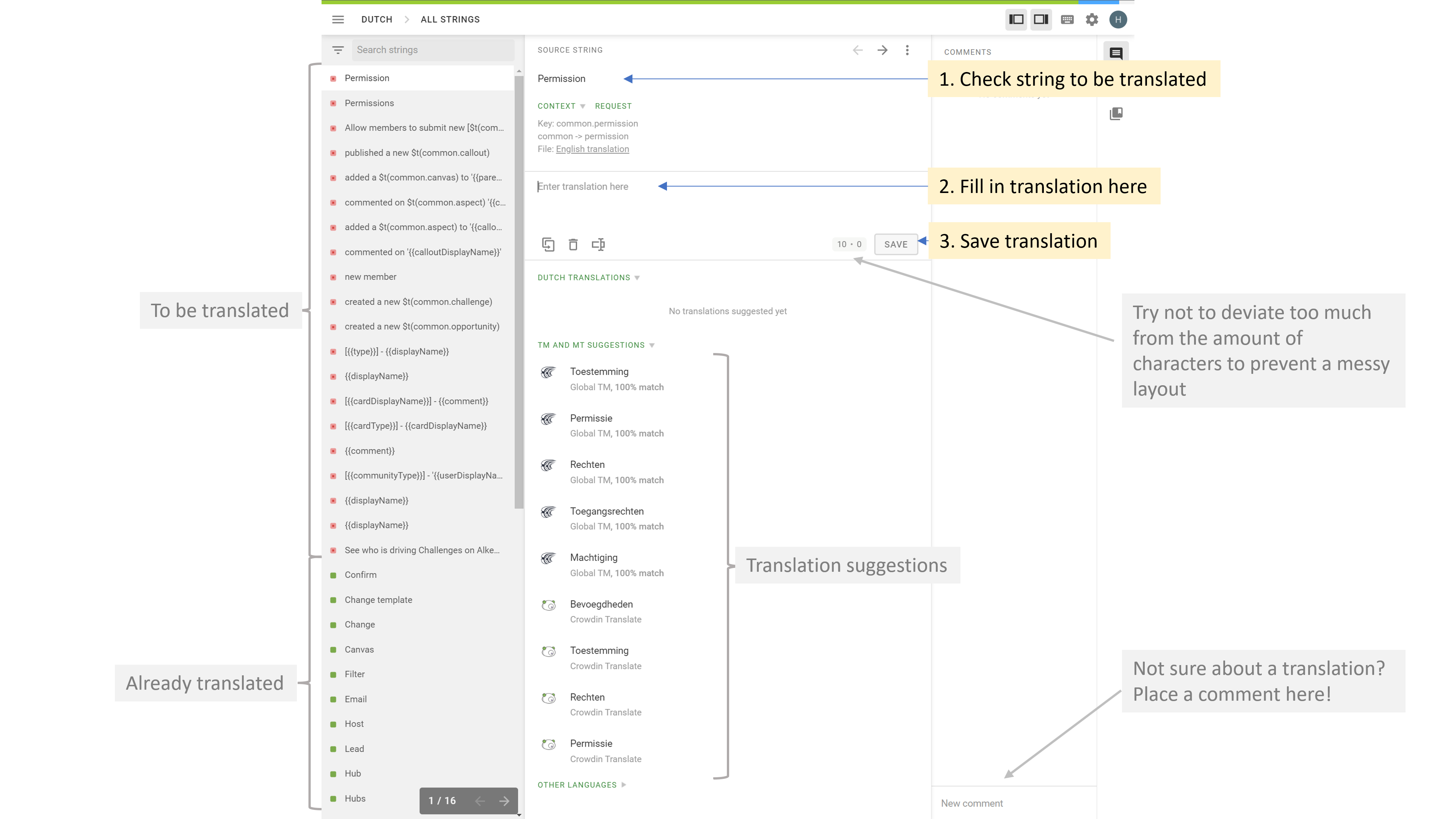 We want to assure that the translations meet our standards and match with our terminology. After you have made the translations, they will be checked by an Alkemio team member before they are implemented on the platform. We will use the comments feature in Crowdin to communicate about debatable translations :smile:.