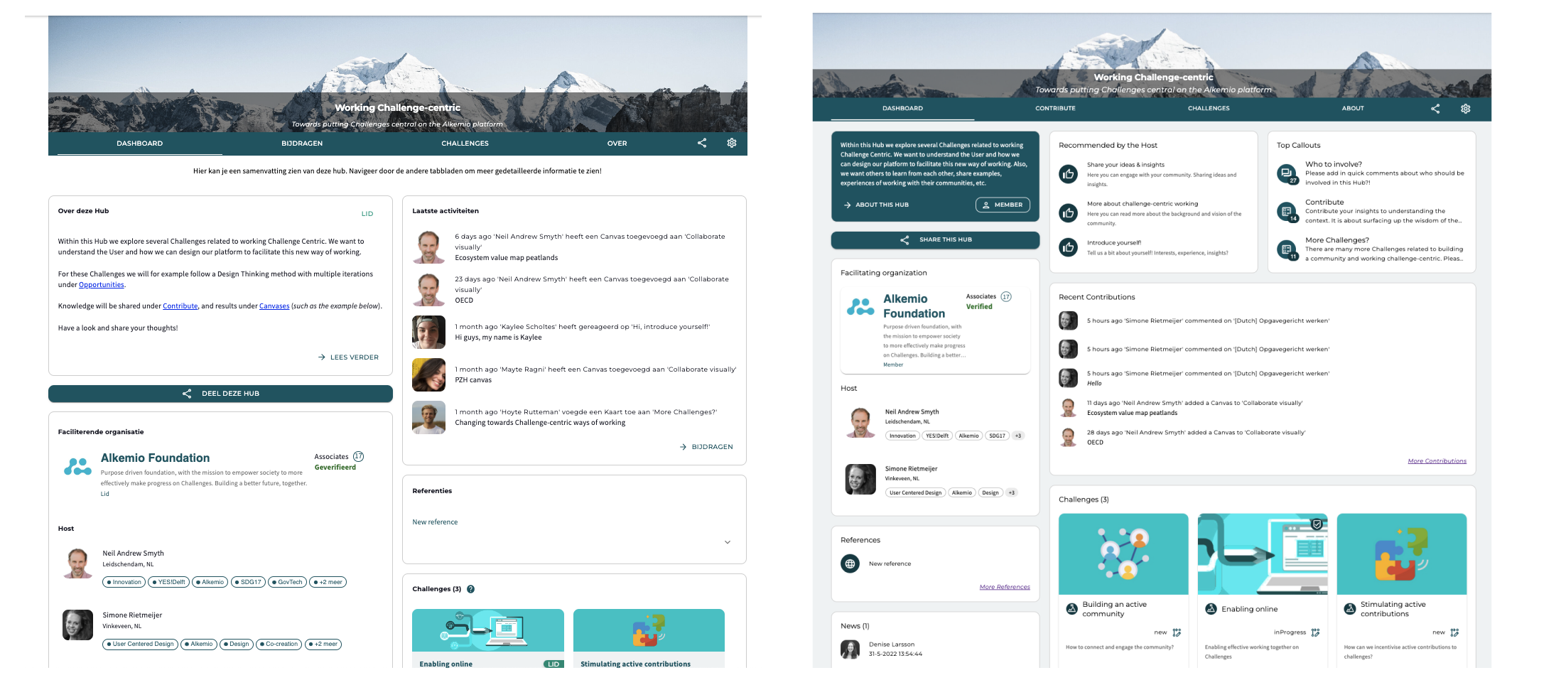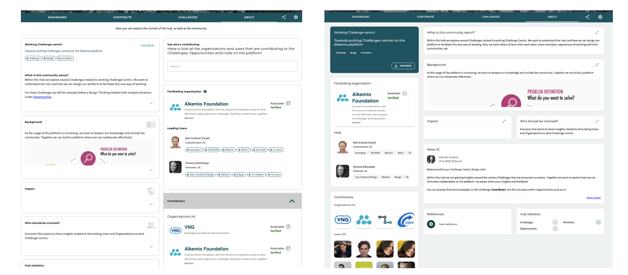 The key focus for this interface refresh has been the journey pages. The switch to a 1:2 layout on this pages allows for a better display of the content. Below you will see the update for each tab within the Alkemio communities.