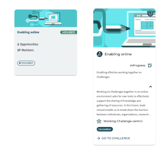 Also, you can see the new design of the cards. When a new user enters the platform, they want to see the topic/vision of each community. In that way they can more easily join the ones of their interest. To guide the user, the cards now includes more context instead of metrics. The cards are expandable for more content and show a preview of the tagline, part of the vision, the innovation flow state, and the community/challenge they are a part of.