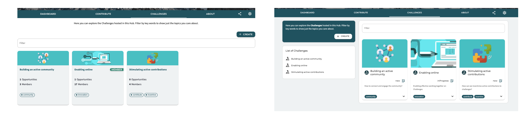 Similar to the contribute page, the number of Challenges can grow quickly as your community starts to expand. Therefore, the list with all Challenges helps you to navigate to the Challenge(s) you are most interested in. Also, the redesigned cards provide more context to trigger members to the Challenges they want to contribute to.