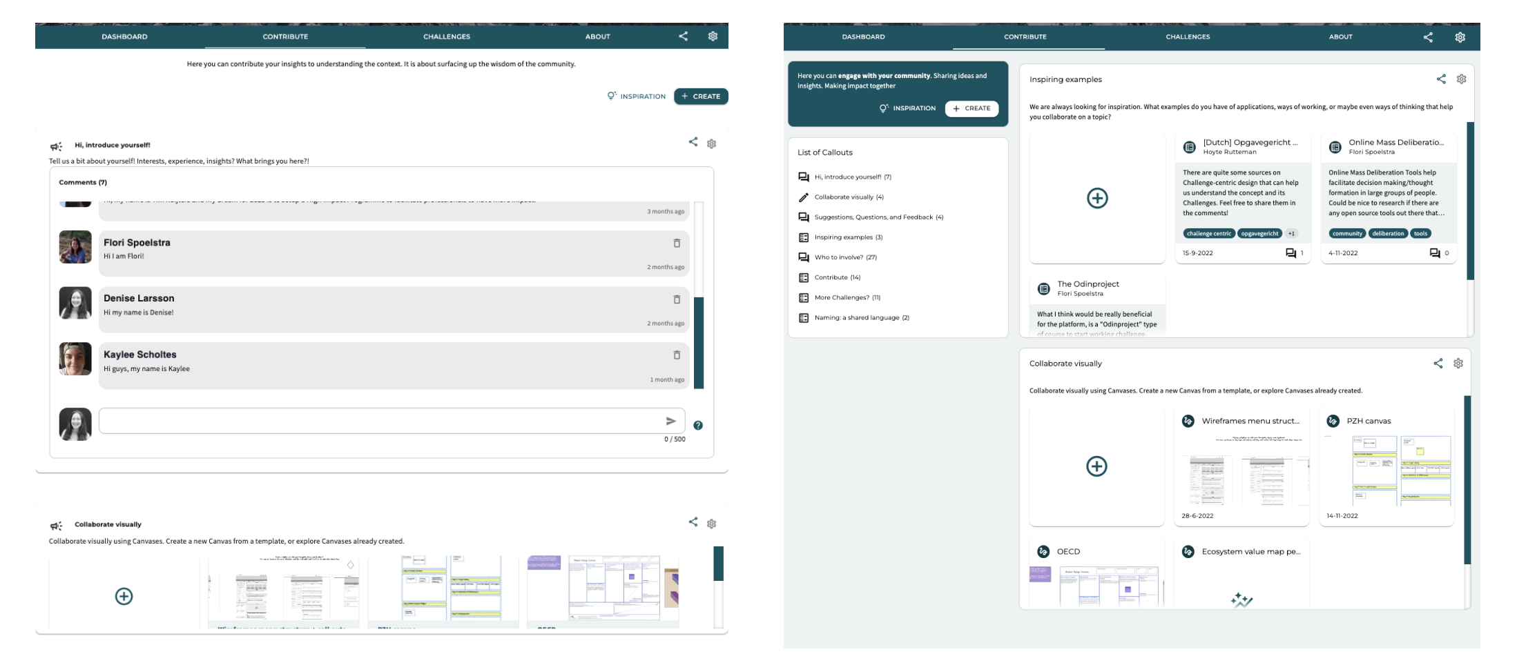 As the number of callouts is growing, navigating them effectively on the contribute page becomes important. Therefore, we have added a list with all callouts. Clicking on one of these callouts will directly navigate you to the callout. Note that there is also a refresh of the cards and whiteboards, again focussing on visualizing the content directly.