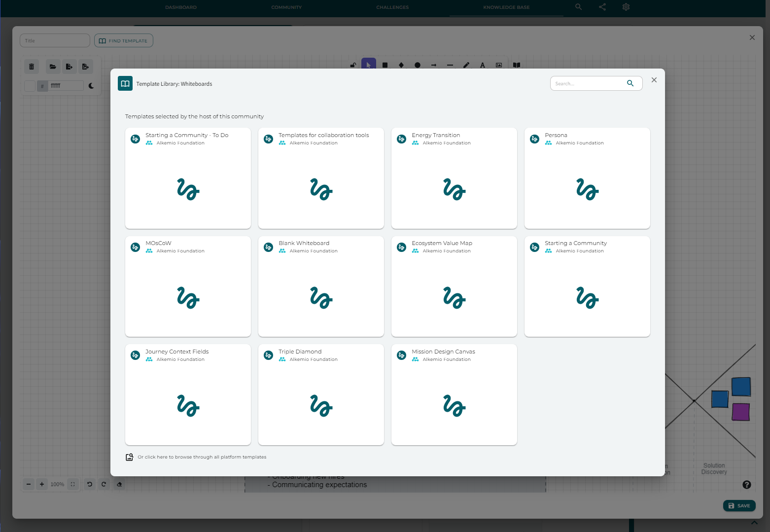 When you open a new whiteboard, you can now choose from the templates selected by the host as well as browsing through all platform templates! This is one step closer to making all knowledge around innovation or community building more directly available for you to use and share!