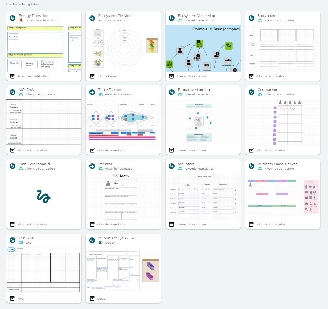 As a user, I want to make use of best practice whiteboard templates to support my innovation or community building efforts. Whiteboards allow you to capture thoughts and give them a visual which will make it easier to start concretly working on a project with different people involved. As a provider of templates, I want them to be available for and widely used by all platform users. Now everyone can access the templates anywhere in the platfrom, and this makes it easier to share and make use of everyone’s knowledge.